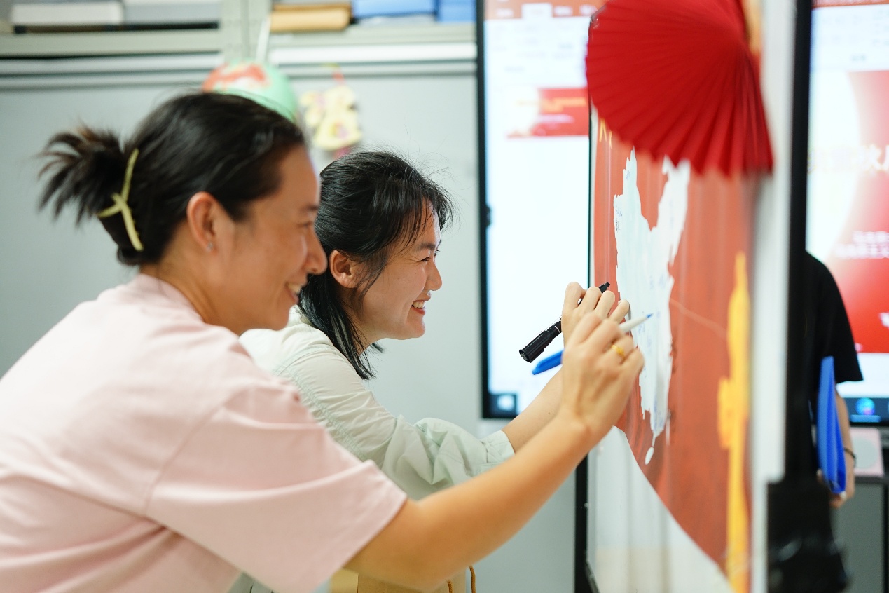 活动的高潮集中在“千万祝福绘山河,一心赤诚贺华诞”国庆签名墙环节。工作人员精心准备了笔墨和签名墙,老师们依次上前,满怀热忱地签下自己的名字。笔尖轻触纸面的瞬间,既传递出对节日的美好祝愿,更表达了对祖国的深厚情感。随着签名的不断增加,原本素净的签名墙逐渐被密密麻麻的字迹覆盖,每一个名字都闪耀着赤诚之光,共同构成现场最动人的“爱国风景线”。