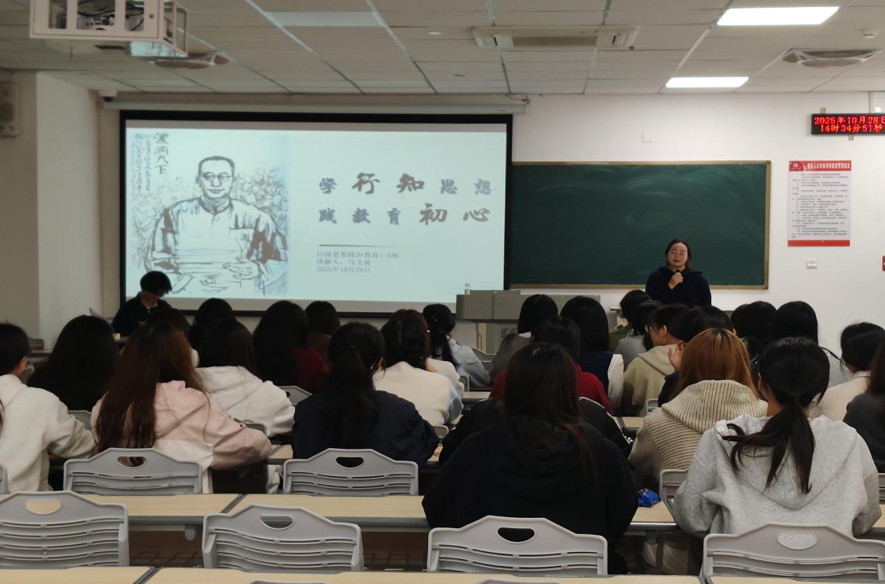 为深化思政专业学生对教育理念的认知,筑牢未来育人初心,2025年10月28日,2025级思政1-5班全体班委在16教306室,共同参与“学行知思想,践教育初心”主题班会,本次班会由辅导员马文茜老师主持。
